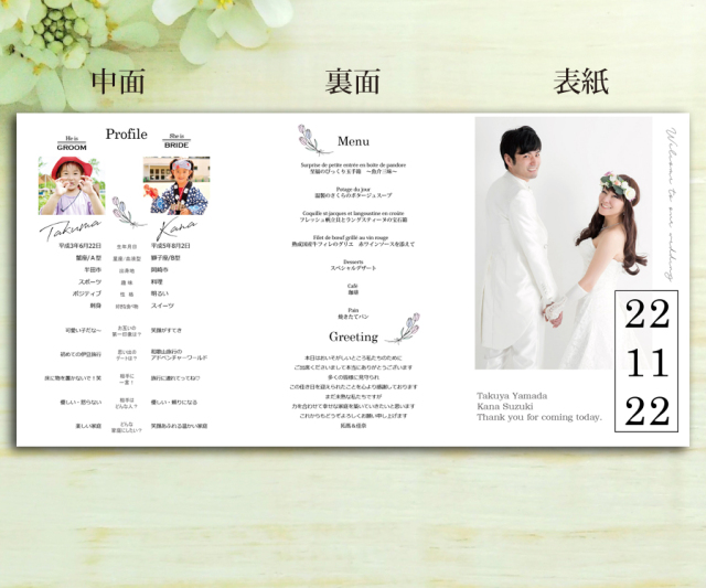 紙は厚く写真がきれいなアートポストでA4ワイドサイズの三つ折。A4サイズとは違い文字が小さくならないのでゲスト様にも失礼になりません。