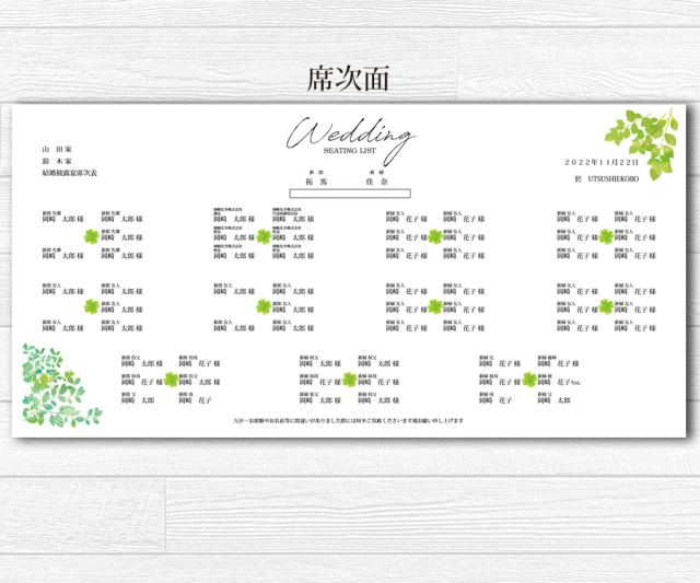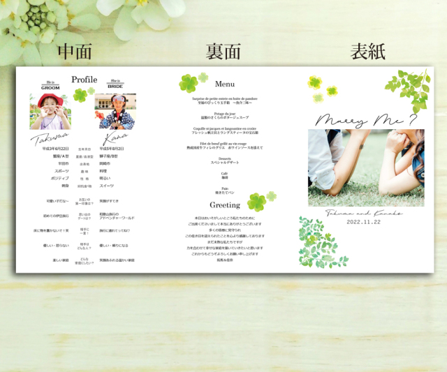 紙は厚く写真がきれいなアートポストでA4ワイドサイズの三つ折。A4サイズとは違い文字が小さくならないのでゲスト様にも失礼になりません。