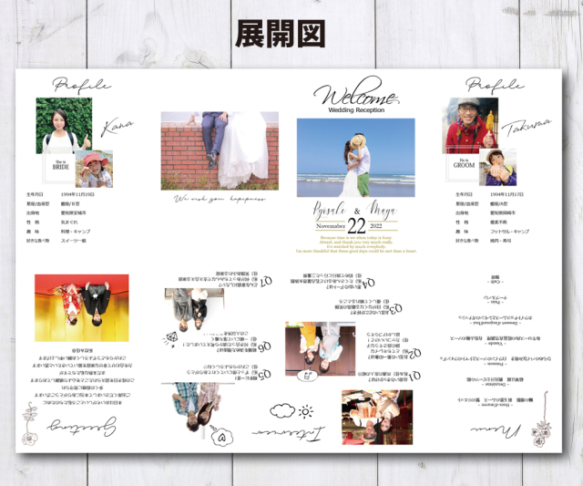 前撮り写真を全面に使用した席次表!手の平サイズの持ち運び便利な席次表!