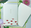 「青海波」は無限に広がる波の文様に未来永劫の願いと人々の平安な暮らしへの願いが込められた縁起の良い柄です。 真紅とパールの二色の箔で、伝統文様を織り交ぜたデザインを繊細に表現し昔ながらの技術で金の縁取りを施しました。招待状のご用意はお任せを!