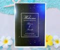 30名様以下の少人数披露宴限定!A4サイズの2つ折タイプ。家族挙式でも記念に席次表があれば、両家の紹介ができます。お二人のプロフィールで自己紹介もできます。星空のおしゃれなイメージ!オーダーメイドも無料!。同じ種類の席札もご用意しております。