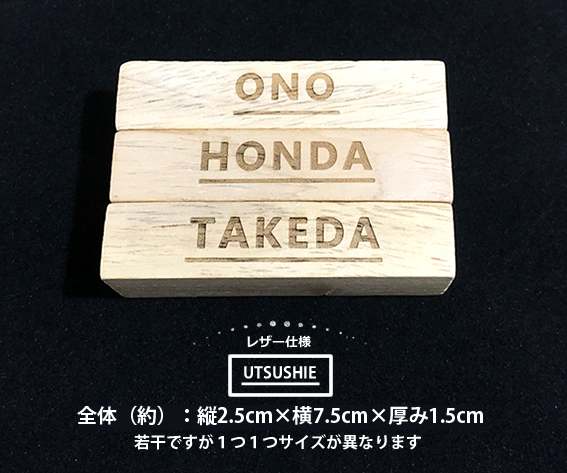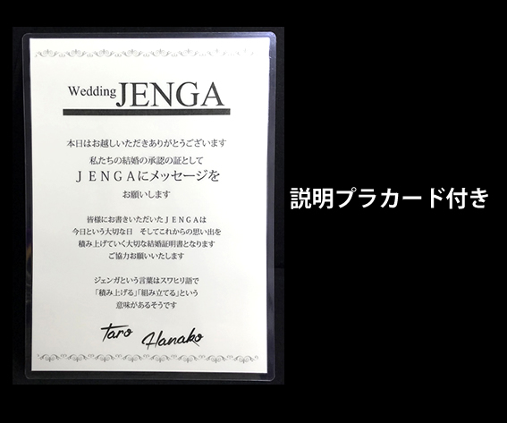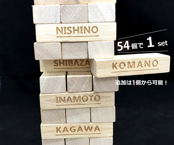 オンリーワンジェンガとしてゲスト様のお名前を1つ1つ彫刻します。ゲスト様のメッセージが入れば思い出のジェンガにもなり、友人や家族と当時を懐かしみながら遊ぶこともできます。