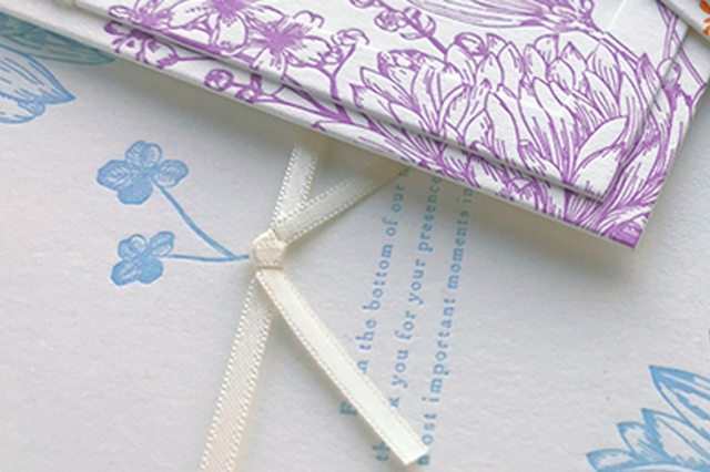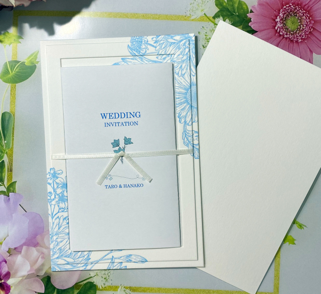 コットンのような手触りの紙に、温かみのある活版印刷で花束をあしらいました。幸せを願う四葉のクローバーがワンポイント。アイボリーのサテンのリボンで結ばれています。招待状のご用意はお任せを!同じ種類の席次表と席札もご用意していおります。