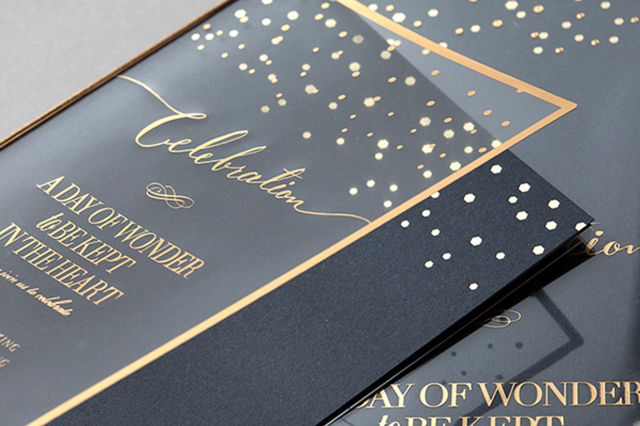 フランス語で「星」を意味する「エトワール」。輝く星空をイメージしています。これからの二人の人生が光り輝くものであるよう、願いを込めて。風合いのあるインディゴブルーの紙と、さらに透明のカバーにも金箔が箔押しされており、幾重にも輝く星々が表現されています。招待状のご用意はお任せを!同じ種類の席次表と席札もご用意していおります。