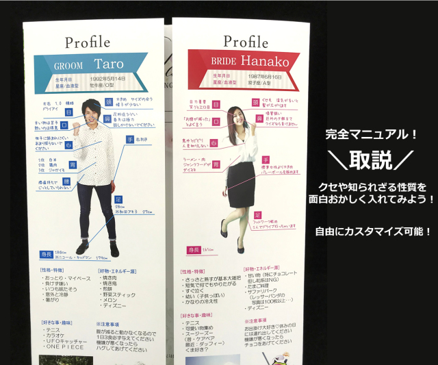 ご自身のマニュアルを考えよう!これからも私たちをよろしくネ!細かく自分たちを紹介しちゃいましょう!アイデア次第で一層面白い席次表が仕上がります。カスタマイズはもちろん無料!用紙サイズはA3(ヨコ420mm×タテ297mm)を使用しております。