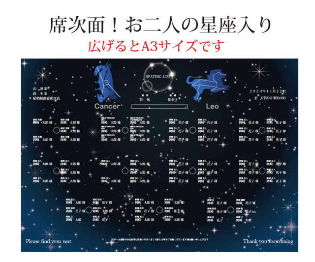 綺麗なネイビーの背景に星が映える!サイズはA3サイズを使用。A4サイズとは違い文字が小さくならないのでゲスト様にも失礼になりません。
